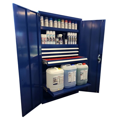 Standing tall at 1800mm with dimensions of 1023mm x 600mm, this cabinet gives you the ultimate storage solution. The standout feature? A dedicated sliding chemical drawer that makes storing and accessing your bulk chemicals safe and simple.
